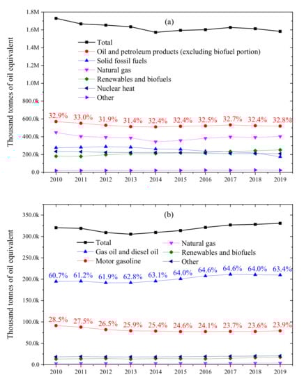 With increasing urbanization, humankind has experienced an escalating dependence on energy. As shown in Figure 1, for EU-28, total energy supply amounted to 1.58M toe (tonnes of oil equivalent) in 2019, and oil and petroleum products represented the highest contribution (32.8%), followed by natural gas (25%), renewables and biofuels (15.8%), nuclear heat (13.2%), and solid fossil fuels (11%). In particular, the contribution of oil and petroleum products in energy supplies has kept with no relevant changes (31.4–33.0%) in the last decade (Figure 1a), with values ranging from 510k (2014) to 569k (2010) toe. Oil and petroleum products are extensively used in our society for transportation, electricity, and construction materials. Transportation may be the sector that most relies on petroleum-based fuels, from ground transportation to planes and ships. In EU-28, the final consumption of energy in the transport sector amounted to 330.8k toe in 2019, being 209.8k toe of gas oil and diesel, 79.1k toe of motor gasoline, 17.4k toe of renewables and biodiesel, and 3.7k toe of natural gas (Figure 1b). In the last decade, gasoline consumption has decreased from 28.5% to 23.9% of the total energy consumed in the transportation sector, whereas gas oil and diesel have increased from 60.7% to 63.4% (Figure 1b).