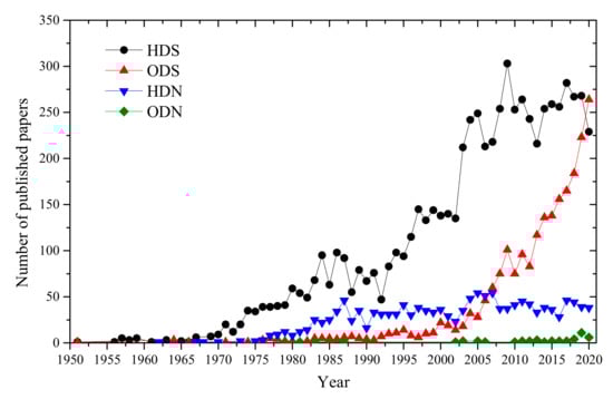 Papers published on HDS, HDN, ODS, and ODN over the years (source: SCOPUS with the keywords “hydrodesulfurization,” “hydrodenitrogenation,” “oxidative desulfurization,” and “oxidative denitrogenation,” respectively, dated August 2021).