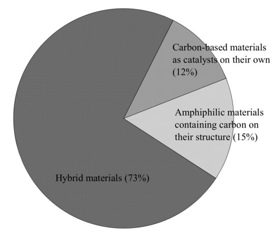 Percentage of published papers regarding the application of (i) hybrid materials containing carbonaceous structures, (ii) carbon-based materials as catalysts on their own, and (iii) systems applying amphiphilic catalysts containing carbon in their structure.