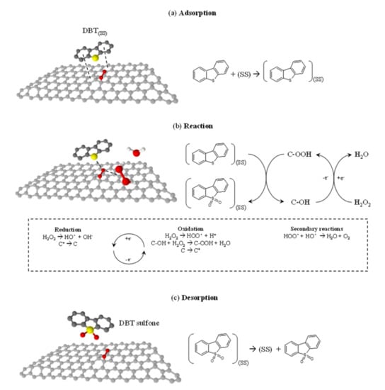 Yu et al. (2010) also observed that the adequate adsorption of DBT into the carbon structure was an essential contribution of the carbon-based support in an HPW/AC catalyst []. Their reasoning is that increased adsorption of DBT leads to a higher collision probability between DBT and active oxygen species from the decomposition of H2O2 that takes place in the active center (HPW). The carbon surface also influences the resonance-stabilization of these active oxygen species, boosting oxidation. Moreover, due to the hydrophobicity of AC, it can be adequately dispersed in the oily phase or placed in the interface between the oily and polar phases, acting as a phase transfer agent []. Kermani et al. (2018) also found that the combination between adsorption capacity towards DBT and adequate lipophilicity of AC structure was an essential feature of the composite Mo132/AC [].