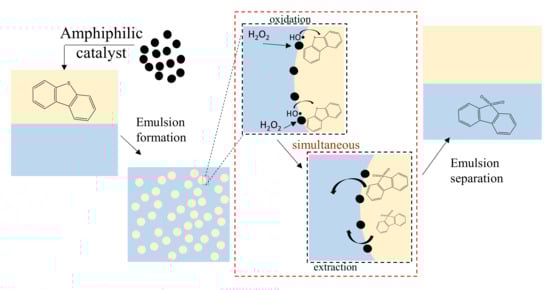 As previously mentioned, both ODS and ODN are primarily conducted in a two-step process. However, in order to cut costs and accelerate the processes, one-pot approaches are increasingly sought. In one-pot approaches, extraction occurs concomitantly to oxidation and, hence, the extractant must be present during the oxidation step. Proper extractants are immiscible with the oil phase and, thus, one-pot approaches are commonly conducted in a biphasic medium. Biphasic systems have some advantages over traditional homogeneous systems. Biphasic systems allow conducting reactions with reactants with distinct solubility behaviors. They allow an easier separation between reactants, products, and catalysts, and the reactions to be conducted with incompatible substances, avoiding interferences [,].