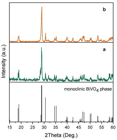 The BiVO4 nanoparticles were synthetized by a modified precipitation process based on a previously reported method (see experimental method in Section 3.1) [23]. The crystalline structure of BiVO4 was first examined by XRD (Figure 1). The X-ray diffractograms of the as-prepared nanoparticles synthetized with SDBS (SDBS-BiVO4) (line a in Figure 1), and without surfactant for comparison (BiVO4) (line b in Figure 1), are consistent with a preferential growth of the monoclinic bismuth vanadate structure [32]. No significant differences on the crystallinity of the monoclinic bismuth vanadate were detected with the incorporation of the surfactant in the synthetic procedure. The average crystallite size was estimated using the Scherrer equation [33] and both samples presented similar values: 29.9 nm and 27.6 nm for SDBS-BiVO4 and BiVO4 samples, respectively.