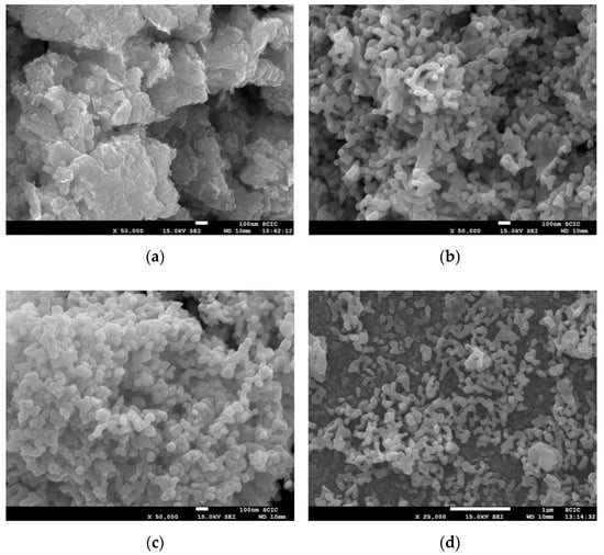The morphology of the bismuth vanadate nanoparticles was studied by scanning electron microscopy (SEM). Figure 2a,b demonstrate a clear effect on the morphology of the material achieved by surfactant-assisted synthesis. Without surfactant, irregular-shaped aggregated particles were obtained; meanwhile in the SDBS-BiVO4 sample, the micrographs revealed mostly a nanoworm-like structure, with rounded particles of around 80–150 nm. The chelating effect of dodecylbenzene sulphonate anions, which interact electrostatically with BiO+ species, limited the access of HVO42− oxovanadate to form BiVO4 nuclei. Thus, the nucleation and growth of BiVO4 crystals in the presence of SDBS was is self-limited, providing a nanostructured morphology. The calcination process slightly affected the morphological features, as revealed in Figure 2b,c and only an effect of sintering was detected, leading to the enhanced interconnection of nanoparticles. These SDBS-BiVO4 nanoparticles were used, to the best of our knowledge, for the first time in this study to produce nanoparticulate photoelectrodes (see Figure 2d for a top view of the film). Such BiVO4 photoelectrodes preserve their nanoworm-like structure. A heterogeneous distribution of the particles on top of the FTO substrates was detected, probably due to the limited adhesion of the NPs to the substrate. Even though the deposition process can be optimized for a more conformal covering of the substrate, the BiVO4 film exhibited a good nanostructure, which was the main objective of the present study. Additional SEM images at different magnifications taken with backscattered electron (BSE) and secondary electron (SE) detectors, as well as the energy- dispersive X-ray spectroscopy (EDS) spectrum for the SDBS-BiVO4 sample, are included as Supplementary Information, Figure S1. The compositional analyses of all the samples made by EDS fit well with the bismuth vanadate stoichiometry.