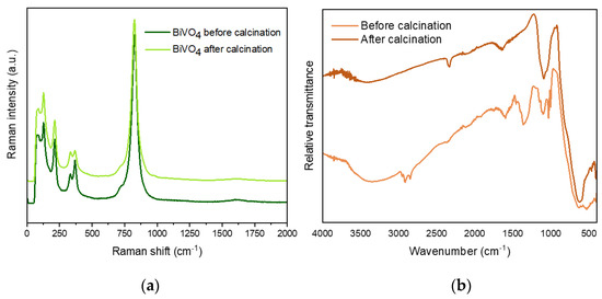 Vibrational spectroscopies (such as Raman and Fourier transform infrared (FTIR) spectroscopy) are useful techniques to probe the local structure of the materials. The Raman spectrum provided important information about the crystalline phase (complementary to XRD) and the coordination of vanadate polyhedra. In particular, the monoclinic-BiVO4 exhibited some characteristic modes corresponding to the tetrahedral VO43− anion. Figure 3a depicts the similar Raman spectra registered for SDBS-BiVO4 before and after calcination, indicating that the synthetic methodology produces BiVO4 in the monoclinic phase. The Raman bands located at 826, 720, 368 and 334 are assigned to the shorter symmetric VO stretching mode (Ag), anti-symmetric VO stretching mode (Ag), asymmetric (Ag), and symmetric deformation of tetrahedral VO43−, respectively, in good agreement with the bands of m-BiVO4 reported in literature [38]. Two external modes of rotation/translation were also identified at 211cm−1 and 126 cm−1 [39].