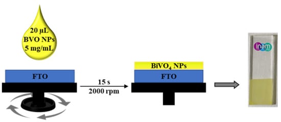 The increasing interest in the use of BiVO4 has led to a large number of studies related to novel synthetic approaches. At present, some of the most common synthetic methods include microwave-assisted [9], co-precipitation [10], hydrothermal, and solid-state reactions [11,12]. Nonetheless, these synthetic processes lead to BiVO4 structures with irregular shapes, large crystal sizes, and low surface area due to the rapid crystal growth of BiVO4 [13]. Furthermore, the difficult deposition on conductive substrates limits their applicability as photoelectrodes [14]. The most efficient BiVO4 photoelectrodes reported to date are grown by electrodeposition [15], metal–organic decomposition [16], spin-coating [17], and spray pyrolysis methods [18,19], but they also present some drawbacks, such as the need for expensive equipment and reagents as well as complicated post-treatments. In particular, compact films are usually achieved by these deposition methods, limiting the obtained photocurrents due to the low exposed surface area. As such, one of the main pathways to increase the photocurrents of photoelectrodes is to increase their surface area per electrode volume by nanostructuring the films and by using BiVO4 nanoparticles (NPs), as it is performed in the present study. This strategy results in the shortening of the distance that minority charge carriers travel to reach the interface, thus reducing electron–hole recombination [20,21].