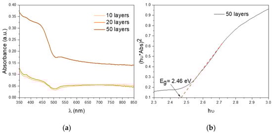 After the synthesis of the SDBS-BiVO4 nanoparticles, BiVO4 films were prepared by spin-coating (represented in Figure 4) and further characterized and tested for the water oxidation reaction. UV-vis spectroscopy is the most common method used to characterized the bandgaps of semiconductors. Efficient light absorption is an essential feature to consider in photoelectrochemical activity of photoelectrodes [42]. Therefore, absorption spectra were recorded for the films with different thicknesses (Figure 5a), showing the typical optical fingerprint for this semiconductor at wavelengths shorter than ~500 nm. The direct bandgap was also calculated from their respective Tauc plots. It is apparent from Figure 5b that the direct bandgap (Eg) of our m-BiVO4 films (50 layers) is 2.46 eV which is consistent with the 2.4 eV reported in the literature for m-BiVO4 [43]. Similar results were obtained for 10 and 20 layers, as shown in the Supplementary Information (Figure S2).