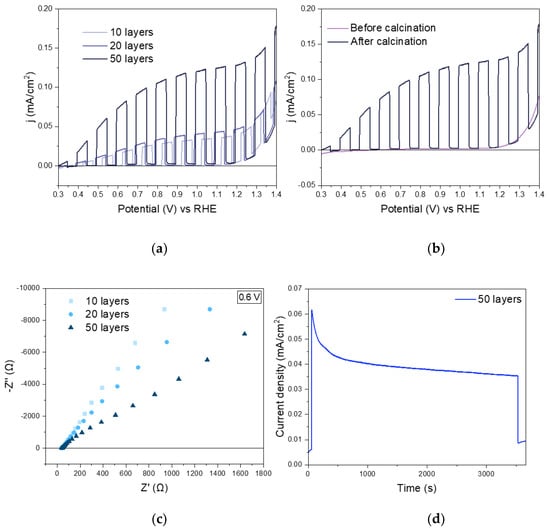 Photoelectrochemical characterization of BiVO4 in 0.1 M potassium phosphate (KPi) buffer containing 0.1 M sodium sulfite. (a) LSV (linear sweep voltammetry) plot under chopped light BiVO4 before and after calcination of the SDBS-BiVO4 (50 layers) photoanode; (b) LSV plots under chopped light of BiVO4 photoanode with 10, 20 and 50 layers; (c) Nyquist plots of the BiVO4 photoanode with different thicknesses and (d) chronoamperometry at 1.23 V vs. RHE of BiVO4 (50 layers).