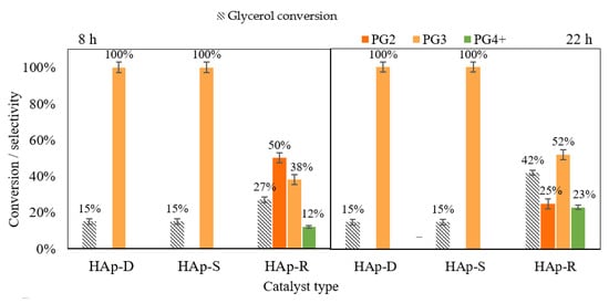 As aforementioned in Section 2.1, HAp-D and HAp-S were deactivated after 8 h of reaction. Here, we assumed that the formed PGs could poison the catalyst surface by physical interaction with the catalyst. This hypothesis was examined by performing a reaction with HAp-S as the catalyst in the presence of 3 wt.% of a PG3 standard. In this case, no glycerol conversion was observed. This result proved that the catalyst’s surface was poisoned by PGs (as illustrated in Scheme 1).