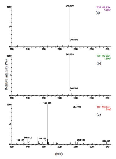 ESI-MS spectra of reaction media when (a) HAp-D, (b) HAp-S, and (c) HAp-R were used as the catalyst at 245 °C after 8 h of reaction.