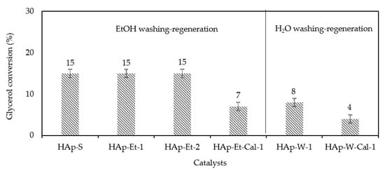 Surprisingly, when the HAp-Et-1 was recalcined prior to the 2nd run reaction, the glycerol conversion decreased to 7% (HAp-Et-Cal-1). Recalcination of spent catalysts was carried out under static air, which probably caused a change in HAp stoichiometry. This could happen by forming carbonated groups due to the presence of O2 or CO2 in the oven atmosphere. This will be further discussed in Section 3.1.