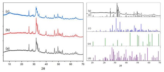 XRD diffractograms of (a) HAp-D, (b) HAp-S and (c) HAp-R (left); and the standard PDF cards for (d) HAp-S, (e) calcium hydroxyapatite, (f) β-TCP, (g) OCP and (h) DCP (right).