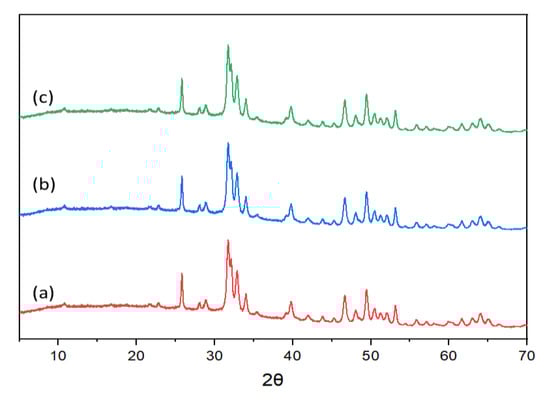 XRD patterns of (a) HAp-Et-1, (b) HAp-W-1, and (c) HAp-Et-Cal-1.