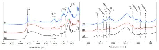 Moreover, three peaks at 878 cm−1, 963 cm−1, and 1017 cm−1 assigned to HPO42− [27,29,33] were observed for all HAp samples (Figure 6e–f). For the deficient HAp, the presence of HPO42− was expected. However, for other HAps, the presence of HPO42− can be explained by A and B-type carbonate substitution.