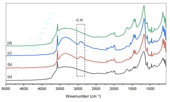 Furthermore, the peak at 3400 cm−1 (3000–3500 cm−1), attributed to the H2O, became more intense for the non-calcined spent catalysts (Figure 7b–c), which suggests that the latter became hydrated during the reaction.