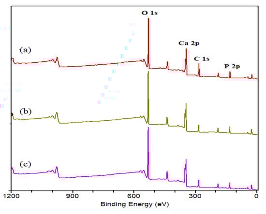 XPS spectra of (a) HAp-D, (b) HAp-S, and (c) HAp-R.