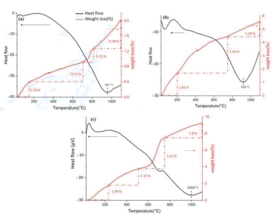 TGA-DSC profiles for non-calcined (a) HAp-D, (b) HAp-S and (c) HAp-R.