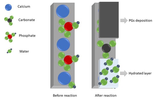 Schematic of HAp’ surface before reaction (left) and after reaction upon poisoning by PGs, water, and carbonate (right).