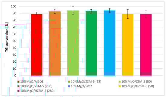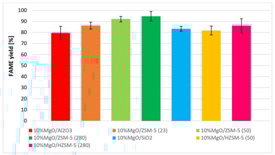 Furthermore, there are differences in catalytic activity between the catalysts impregnated onto the hydrogen form of ZSM-5 zeolites and the catalysts impregnated directly onto the NH4-ZSM-5 zeolite. For the catalysts on the HZSM-5 support, the TG conversion is lower by about 5%, while the FAME yield decreased by about 8–10%, in comparison to the catalysts impregnated on the NH4-ZSM-5 form of zeolite. This implies that no prior calcination of the zeolite support is needed to achieve high activity in the tested process. The catalytic system having the highest activity was the one containing 10% MgO/ZSM-5 (Si/Al = 280). This catalyst exhibited the highest value of FAME yield of 94.6% with the second highest triglyceride conversion (92.9%). This catalytic system, due to its high activity and high selectivity makes it considerable to use for testing it on an industrial scale.