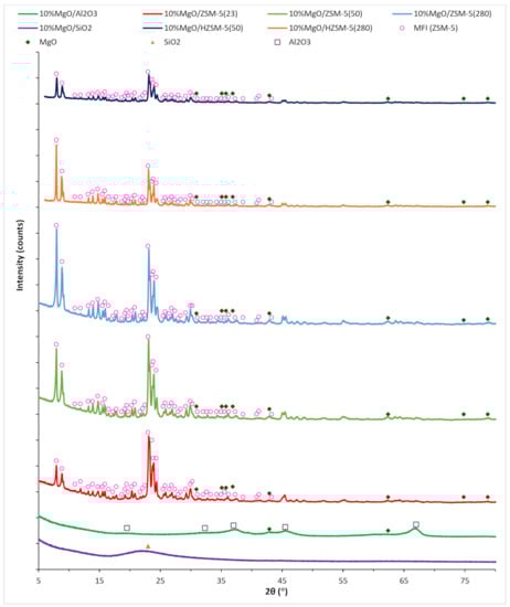 The XRD analysis was performed and also used to determine the phase composition studies of the magnesium oxides supported zeolite catalysts after their calcination process. The analysis of these measurements were given in Figure 3. Analyses of the diffraction patterns of the calcined magnesium oxide catalysts showed the respective diffraction peaks for the relevant catalysts. The characteristic diffraction peaks for magnesium oxide (MgO) are visible at 2θ = 30.92°, 35.08°, 35.77°, 36.87°, 42.88°, 62.38°, 74.81° and 78.75°. Zhou Shijian et al. [] in their work used MgO-Al2O3/ZSM-5 catalysts synthesized in a solid state reaction for the dehydrogenation of propane. On the XRD patterns, they observed MgO species at angle values of 2θ = 43° and 62°, confirming the presence of MgO on the zeolite surface. Shaheen et al. [], in their work, investigated among others MgO nanocatalyst in the conversion of Silybum eburneum seed oil to liquid biodiesel. On the X-ray diffractogram, they identified three reflexes attributed to MgO at 2θ = 36.8°, 42.8° and 62.1°, which correspond to (111), (200) and (220), respectively. The latter diffraction MgO peaks are corresponding to (004) for 2θ ≈ 31°; (311)—for 2θ ≈ 75° and (222) for 2θ ≈ 78°, respectively []. The rest of the diffraction peaks visible on the XRD patterns of the tested catalysts originated from the ZSM-5 zeolites (with the following 2θ angle values: 7.91°, 8.84°, 10.94°, 11.85°, 13.14°, 13.85°, 14.70°, 15.46°, 15.86°, 16.45°, 17.18°, 17.73°, 18.62°, 19.15°, 19.43°, 19.68°, 20.26°, 20.76°, 21.64°, 22.07°, 22.43°, 22.96°, 23.61°, 23.80°, 24.65°, 25.44°, 25.77°, 26.45°, 26.82°, 27.38°, 27.91°, 28.29°, 29.14°, 29.90°, 30.23°, 31.07°, 32.01°, 32.60°, 33.23°, 34.22°, 34.95°, 35.52°, 36.21°, 37.26°, 38.57°, 40.79°, 41.16° and 43.26°). All the MgO catalyst samples supported on the ZSM-5 zeolites display sharp intensity peaks on the XRD patterns, which can be considered good preservation of the ZSM-5 zeolite structure during sample preparation []. An analysis of the diffraction curve of 10% MgO/SiO2 catalyst shows that this sample is a completely amorphous system. The pattern presents only a broad diffraction peak with a value of 2θ angle equals 23.00° assigned to the silica crystallographic phase. Unfortunately, the amorphosity of 10% MgO/SiO2 catalyst did not allow the crystallite size to be determined from the XRD data obtained using the Scherrer equation. The XRD diffraction curve recorded for the 10% MgO/Al2O3 catalyst showed slightly better crystallinity compared to the MgO catalyst supported on silica. The XRD pattern of this system shows diffraction peaks with values of 2θ = 19.51°, 32.30°, 37.18°, 45.50° and 67.09° attributed to the γ-Al2O3 []. Boz et al. [] identified that diffraction peaks at 2θ = 37.0°, 46.0° and 67.0° correspond to the γ-Al2O3 polymorphic form. There are also visible reflexes on the pattern derived from MgO at 2θ = 42.88°, 62.38°.