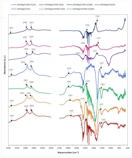 The next stage of physicochemical studies conducted on the synthesized catalytic systems investigated the sorption properties of MgO catalysts supported on ZSM-5 zeolites with different SiO2/Al2O3 ratios calcined at 500 °C in an air atmosphere for 4 h with the methanol-argon mixture. In addition to this, MgO/Al2O3, MgO/SiO2 and MgO/HZSM-5 systems, which were prepared and calcined in an air atmosphere for 4 h at 500 °C for comparison, were also investigated. The purpose of this study was to clarify and understand the activity of the studied systems in the biodiesel production process. The results of FTIR studies are shown in Figure 4. Several characteristic IR bands can be easily distinguished in the spectra recorded for the studied catalysts. The bands seen in the FTIR spectra above 3250 cm−1 for the MgO catalysts supported on ZSM-5 zeolites correspond to the assigned OH stretching []. All the catalysts in the IR spectra show specific bands in the region 2956–2948 cm−1, which are attributed to (νasym(CH3)) antisymmetric CH stretching vibrations and in the region 2859–2832 cm−1, which corresponds to (νsym(CH3)) symmetric CH stretching vibrations from methoxy groups [,]. It should be emphasized that the highest intensity of these bands was observed for the 10% MgO/ZSM-5(23) system, which confirms the strongest adsorption of methanol on the catalyst surface compared to the other studied catalysts. On the other hand, the intensity of these bands is smaller for the 10% MgO/ZSM-5(50) and 10% MgO/ZSM-5(280) catalysts. This result indicates that increasing the silicon to aluminum ratio in the catalytic system reduces the sorption properties of the catalytic system in relation to methanol. The FTIR analysis performed for the catalysts supported on hydrogen form of the HZSM-5(50) zeolite showed similar bands on the IR spectrum as for the corresponding catalyst impregnated directly onto the ammonium form of the ZSM-5 zeolite. While the IR bands located in the spectrum of 10% MgO/HZSM-5(280) are much more intense than those recorded for 10% MgO/ZSM-5(280) catalyst. Whereas the FTIR measurements performed for 10% MgO/HZSM-5(50), 10% MgO/HZSM-5(280), 10% MgO/ZSM-5(23) and 10% MgO/ZSM-5(50) catalysts confirmed the occurrence of additional weak IR bands located in the range 1927–1991 cm−1 on the FTIR spectrum which are corresponding to a shift of the Si-O combination bands of the adsorbent. In addition, the spectra recorded for all catalysts, with the exception of the 10% MgO/ZSM-5(23) catalyst, show strong bands located at the value of 1576–1589 cm−1, which are characterized by deformation vibrations occurring in -OH species []. The negative band above 1600 cm−1 that appears on the FTIR spectra is most likely due to the removal of initially adsorbed water (δ(OH)) []. The intense negative bands seen in the wavenumber range of 1200–1331 cm−1 can be attributed to the δ(OH) modes of H–bonded zeolite hydroxyls [].