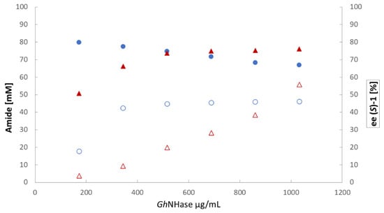 As indicated in Table 1, entry 7, elevated biocatalyst amounts significantly increased the formation of the desired amide. Figure 1 shows the dependence of the reaction on various biocatalyst amounts. The highest enantioselectivity was observed between 300 and 600 µg/mL of GhNHase and is associated with 85–90% of the analytical yield at 50 mM of the substrate load. A further increase in the catalyst amount resulted in a decrease in the product ee. At the same time, the total amount of product could not be increased further. The result was remarkably different at the 200 mM substrate load. Small amounts of catalysts could not cope with the high substrate load and produced much less amide with moderate ee. By increasing the biocatalyst load, both the product amount and its ee approached high levels. We assume that this phenomenon is due to the inhibiting effects of cyanide. During the course of the racemization of (R)-1a, the reaction solution contains propanal and cyanide. At a neutral pH, the formation of a racemic cyanohydrin occurs. Since cyanohydrins have been reported to be substrates of nitrile hydratases [], the formation of a hydroxyamide is a possible side reaction, which would pull two essential reaction components from the system in an irreversible manner. This side reaction was elucidated in the case of the cobalt-dependent CtNHase by HPLC/MS and explained why (S)-1b titers remained well below the theoretical 100% []. We therefore hypothesized that the remaining 10–15% required for full conversion by GhNHase was also associated with the formation of 2-hydroxybutane amide. Increasing the substrate load to 200 mM indicates inhibition by substrate or one of the emerging components during DKR, because less product is formed in the same timeframe as compared to the 50 mM reactions. These results emphasize the importance of balancing the velocity of the GhNHase-mediated hydration of the desired enantiomer with the reassembly velocity of racemic 1a.