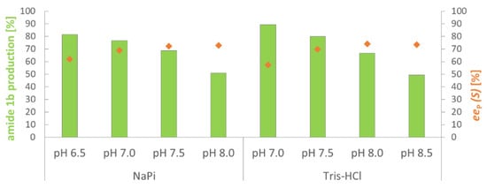 The pH value is a critical factor in biocatalytic amide synthesis in general, and particularly in (S)-1b synthesis. The substrate is a labile α-aminonitrile. It is in equilibrium with its three building blocks pyrrolidine, propanal and cyanide []. When 1a is incubated at different pH values, the formation of hydrocyanic acid can be detected in the headspace of the reactions []. At pH 10, 1a disintegrates slowly, whereas low pH (pH 5.0) favors substrate dissociation within seconds (Figure S4). Nitrile hydratases show the highest activity from pH 7 to 8 [], and the activity may also depend on the nature and strength of buffer components [,]. Taken together, these interdependent parameters require experimental exploitation, and we observed the same trend in two buffers as depicted in Figure 2: The lower the pH, the more product formed. Confirming the observations made in Figure 1, the analytical yield and the ee followed a reciprocal dependency. A similar trend can be observed when GhNHase is applied as a whole-cell biocatalyst (Table S1). The most promising combination of the product titer and ee was obtained in Tris-HCl at pH 7.5.