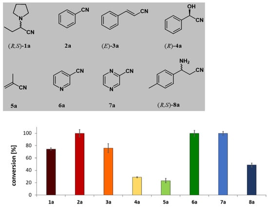 GhNHase proved to be a promising enzyme for levetiracetam synthesis. Many other APIs that harbor amide groups and nitriles are frequently chosen as the precursor group to introduce the amide moiety []. In general, enzymes are frequently incorporated in API synthesis due to their unique selectiveness [,,]. In this light, the ability of GhNHase to produce a variety of structurally diverse compounds was studied (Figure 3). Benzonitrile (2a) was chosen as a model substrate for aromatic amide precursors. Cinnamonitrile (3a), [] mandelonitrile (4a) [] and 3-amino-3-tolyl-propanenitrile (8a) [] are representatives of aryl-aliphatic nitriles. Methacrylonitrile (5a) is a small, aliphatic nitrile that is often used as a test substrate for NHase activity []. The nitrogen-containing aromatic heterocyclic compound 3-cyanopyridine (6a) is the precursor of nicotinamide (6b) []. Pyrazine-2-carbonitrile (7a), a heteroaromatic compound with two nitrogen atoms, gives pyrazine-2-carboxamide upon hydration, which is known to be an antitubercular agent []. The levetiracetam precursor 1a represents a non-aromatic heterocyclic compound. Consistent with our results in the photometric assay that was used to study inhibition phenomena (data not shown), 5a was a poor substrate of GhNHase [], and so was 4a. About 50% of 8a was converted to the respective amide under the tested conditions, indicating enantioselectivity for one of the enantiomers. GhNHase showed full conversion of the nitriles 2a, 6a and 7a, indicating a preference for substrates with the cyano group directly attached on an aromatic system. Under modified conditions, the nicotinamide precursor 6a appears to be the preferred substrate of GhNHase among the three substrates with full conversion: 2a, 6a, and 7a (Figure S5).