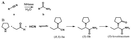 (A) NHase-mediated nitrile hydration; (B) synthetic route to levetiracetam.