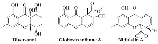 There has been considerable interest in the development and synthesis of xanthene derivatives because of their wide range of biological and pharmaceutical applications. Xanthene’s moiety exhibits a range of valuable properties that could be put to use in biological contexts, such as antiviral, antibacterial and anti-inflammatory properties [1]. Moreover, functionalized xanthenes, such as diversonol, globosuxanthone A and nidulalin A, are used as anticancer drugs (Figure 1).