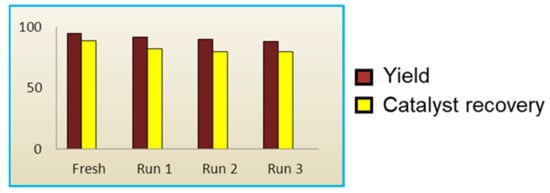 The principles of green chemistry tell us that organic reactions are superior if they produce a good product yield within a short reaction time and using safer techniques. Along with these conditions, another important factor is the reusability of the catalyst, which gives us information about how much longer our catalyst is active for. Therefore, the possibility of recycling the catalyst was examined for the same model reaction.