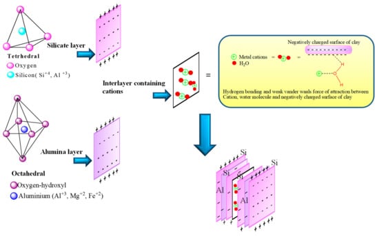 Bleaching earth is a type of clay mineral. Composed of hydrated aluminosilicates, it always contains large amounts of crystalline silica. Silicates have a tetrahedral structure, while aluminates are octahedral and have a structure composed of separate layers like sheets of paper. Each clay sheet is slightly separate from those on either side, having negative charges on its surface and positive charge on edges. Negative charges are balanced by the positive charges present inside them in the form of cation (e.g., Si+2, Al+3, Fe+2, Mg+2). Each layer is separated internally by an interlayer space, as shown in Figure 3. These interlayers also contain adsorbed cation which is bonded to water molecules through weak Vander-waals forces. At low pH (acidic) environment these aluminosilicate layers are positively charged on their edges but become negatively charged in a high basic pH environment. Thus, at pH 12.5 the surface and edges of clay become fully negatively charged. The origins of charge deficiency on aluminosilicate layers can be seen by following the reaction in Scheme 3.