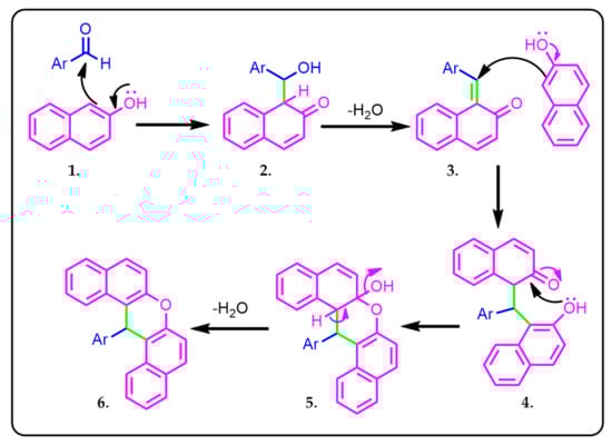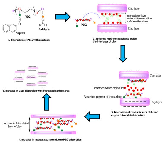 PEG is made up of ethereal oxygen linkages and free hydroxyl groups. During the reaction PEG increases the electrophilicity of carbonyl carbon and the nucelophilicity of β-napthol through hydrogen bonding, as shown in Figure 4. PEG, along with the reactant, enters in the intercationic layer of clay where already most of the water molecules along with adsorbed cations are present at the negative surface of the clay. But when PEG enters inside the interlayer, water molecules are desorbed from the surface whereas PEG, along with the reactants, is adsorbed at the clay surface [37,38]. Afterwards, an increase in the concentration of PEG inside the interlayer results in an increase in the distance between intercalations, and finally the dispersion of clay with a large surface area takes place. As the surface area increases, more and more adsorption of PEG along with reactant molecules takes place, which results in good productivity. A possible detailed mechanism for the synthesis of xanthene derivatives is shown in Scheme 4.