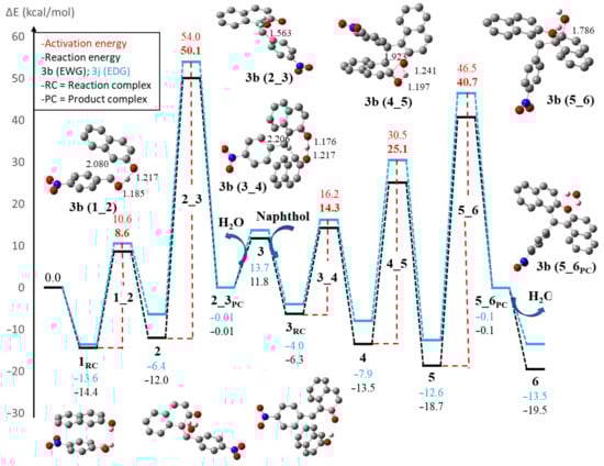 Reaction energy profile for the xanthene derivative formation using the M06-2X/6-31G(d,p) level of theory. The activation energy (red) for 3b is shown in bold and for 3e in light.