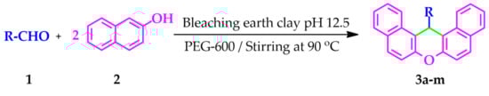 Recently, attention has been drawn to the development of environmentally benign solvents, such as ionic liquids [34], water [35] and polyethylene glycols [36]. The value of a new solvent medium primarily depends on its environmental impact, the ease with which it can be recycled, low vapor pressure, non-inflammability and high polarity for solubilization. Herein, we wish to report bleaching earth clay and PEG-600 as a new and efficient recyclable medium for the synthesis of 14-substitued-14-H-dibenzo[a,j]xanthenes by reacting β-naphthol with aldehydes (Scheme 1).