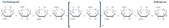A representation of a cellulose chain, with reducing and non-reducing ends indicated. The blue brackets with subscript “n” indicate that the degree of polymerization (DP) of the cellulose chain is longer than a DP of 10.