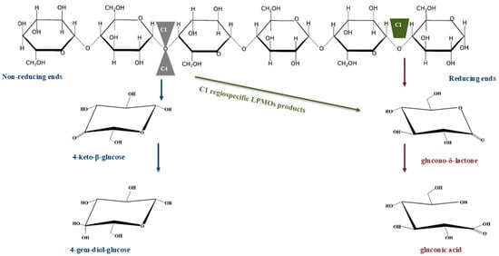 Two other enzyme systems play a significant role in cellulose saccharification, these being LPMOs and non-hydrolytic enzymes (expansins and swollenins). Forsberg et al. [] demonstrated that the LPMOs sourced from bacteria and fungi were originally classified into CBM family 33 and GH61, respectively. According to the CAZy database, the enzymes classified under CBM33 were later assigned to auxiliary activities family 10 (AA10), while those in GH61 were assigned to AA9 (http://www.cazy.org/Auxiliary-Activities.html; accessed on 30 June 2021). The LPMOs in family AA9 and AA10 are copper-dependent enzymes that cleave the glycosidic bonds of crystalline cellulose regions by oxidizing the C1 (EC 1.14.99.54) or C4 (EC 1.14.99.56) and C1/C4 of the glucose residues [,] (see Figure 3). The LPMOs in family AA16 are newly classified cellulose-specific enzymes with C1 regiospecificity []. Kadowaki et al. [] demonstrated that some LPMOs sourced from Myceliophthora thermophila, belonging to AA9D, have regiospecificity for C1, and those sourced from Aspergillus nidulans, belonging to AA9 (also known as 22), and from M. thermophila, belonging to AA9J, have regiospecificity for C4. Additionally, the LPMOs sourced from M. thermophila (belonging to AA9I), Thielavia terrestris (belonging to AA9E), and Thermoascus aurantiacus (belonging to AA9A) displayed regiospecificity for both C1 and C4 (referred to as C1/C4). Both bacterial and fungal LPMOs have similar structures and mechanisms of action []. The catalytic domain of LPMOs can also be attached to CBMs by a flexible linker [,]. Furthermore, Isaksen et al. [] demonstrated that the fungal LPMO-AA9C, sourced from Neurospora crassa, was capable of cleaving polymeric cellulose and cello-oligosaccharides with a degree of polymerization of about four to six. The LPMOs cleaved the C1 of cellulose or cello-oligosaccharides to produce aldouronic acids; however, when they acted on the C4, they produced gem-diol [,]. The LPMOs from families AA9, AA10, and AA16 have been reported to synergize with cellulases to enhance the saccharification of cellulose [,,].