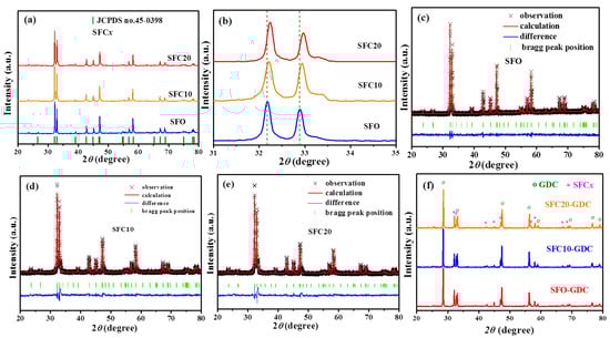 (a) XRD spectra of SFCx samples; (b) XRD pattern of SFCx within a diffraction angle of 2θ = 31–35°; the refined XRD patterns of SFO (c), SFC10 (d) and SFC20 (e); (f) XRD spectra of SFCx-GDC composite after being calcined at 1000 °C for 12 h.