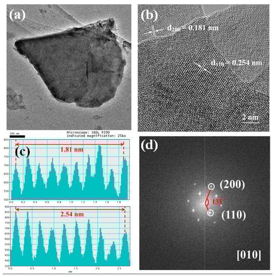 Figure 2a shows the HR-TEM of the SFC10 sample. The crystallized lattice fringes with distances of 0.181 nm and 0.254 nm agree well with the (200) and (110) planes in the SFC10 phase, respectively (Figure 2b), as revealed in the respective intensity distribution figures of the lattice planes (Figure 2c). This result is demonstrated by the fast Fourier transform (FFT) pattern along the [010] zone axis, with the correlative (200) and (110) diffraction planes, as displayed in Figure 2d.