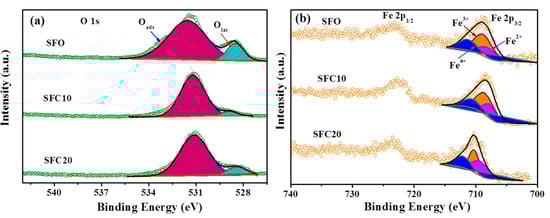 (a) O 1s and (b) Fe 2p3/2 spectra of SFCx samples.