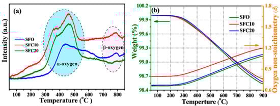 O2-TPD is an effective method for evaluating the oxygen exchange capability of the oxide. Figure 4a displays the O2-TPD plots of SFCx samples. Two obvious desorption peaks are observed in the samples. The first desorption peak at 250–550 °C corresponds to the α-oxygen desorption, resulting from the reduction of Fe4+ to Fe3+ and chemisorbed oxygen desorption on the surface []. The second peak, at around 800 °C, can be attributed to β-oxygen desorption with the further reduction of Fe3+ to Fe2+ []. It is observable that the peak areas of α-oxygen desorption for SFC10 and SFC20 are higher than those of SFO, confirming that Cu doping improves the oxygen surface exchange capability. It should be noted that the SFC10 sample presents the highest peak area of α-oxygen desorption among the SFCx materials, suggesting a higher oxygen vacancy concentration and better oxygen ionic mobility of the compound. The oxygen non-stoichiometry (δ) of the SFCx materials at elevated temperatures was investigated by the TGA. The δvalues are calculated by combining the TGA result and the oxygen non-stoichiometric values (δ0) of SFCx at room temperature as obtained by the iodometric titration method. We found that the weight of SFCx materials stays unchanged from 50 to 250 °C. When the temperature is over 250 °C, the rapid weight loss can be attributed to the release of the lattice oxide, which corresponds to the reduction of Fe ions and then the generation of oxygen vacancy [], as shown in Figure 4b. The formation of the oxygen vacancy can be written in Kröger–Vink (KV) notation (1) as follows: