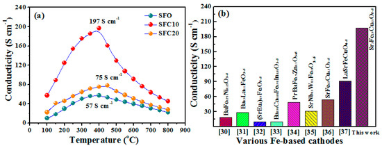(a) Electrical conductivity of the SFCx materials at 100,800 °C; (b) maximum value of the conductivity for various Fe-based cathodes.