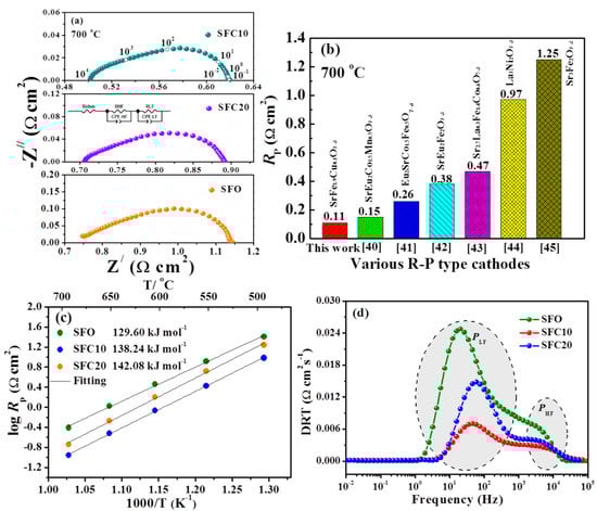 (a) EIS patterns of SFCx cathode collected at 700 °C in air; (b) Rp value of various Ruddlesden−Popper-type cathode materials at 700 °C; (c) Arrhenius curves of polarization resistance for SFCx cathode materials at 500–700 °C; (d) DRT analysis of the impedance spectra for SFCx electrodes at 700 °C.