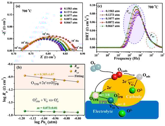 (a) Impedance spectra of the SFC10 electrode under various Po2 at 700 °C; (b) RHF and RLF of the SFC10 electrode vs. Po2 at 700 °C; (c) DRT curves of SFC10 electrode under various Po2.
