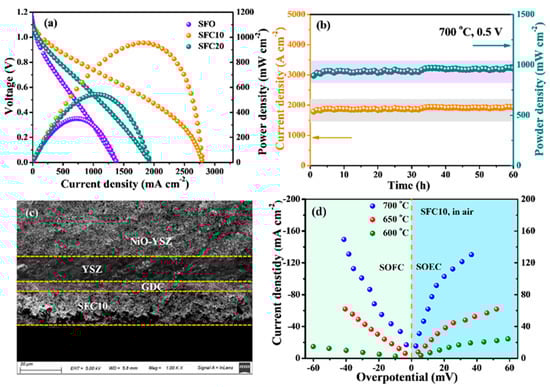 To further explore the electrocatalytic performance of the SFCx cathodes, a series of anode-supported button cells were prepared and measured at 600–700 °C, as depicted in Figure 8a and Figure S3. The single cells comprise a ~300 μm-thick Ni-YSZ anode layer, a ~10 μm-thick dense YSZ electrolyte layer, a ~3 μm-thick GDC diffusion barrier layer and a ~20 μm-thick porous SFCx cathode material layer, respectively (Figure S2). The maximum power density (MPD) of the fuel cells with SFO, SFC10 and SFC20 cathodes is 351, 955 and 544 mW cm−2 at 700 °C, respectively. The optimal performance of the SFC10 cathode may be due to the satisfactory electrochemical activity for ORR. It is worth noting that the MPD of the SFC10 cathode-based fuel cell at 700 °C is higher than that of R–P perovskite cathode materials, such as Sr3Fe1.9Ni0.1O7−δ (218 W cm−2) [], Sr3Fe1.3Co0.2Mo0.5O7−δ (300 mW cm−2) [] and Sr3Fe1.8Co0.2O7−δ (840 mW cm−2) []. The long-term durability test result of the button cell with SFC10 cathode is depicted in Figure 8b. More importantly, the PPD of the single-cell maintains a steady value without any distinct change for 60 h at 700 °C, revealing that the SFC10 cathode holds satisfactory electrochemical stability. Furthermore, Figure 8c represents a cross-section image of the button cell after a 60 h durability test. Evidently, the SFC10 cathode layer affords appropriate porosity and coheres well with the GDC barrier layer. No obvious crack or delamination at the anode/electrolyte/cathode/barrier layer interfaces is visible, which favors the gas diffusion between the button cell components. The polarization plots of the three-electrode cell were further measured in the SOFC and SOEC modes at different temperatures (Figure 8d). For the SOFC mode, the density reached −150 mA cm−2 when the cathode overpotential was −41.28 mV. For the SOEC mode, when the density was 130 mA cm−2, the anode overpotential was 36.61 mV. The above results reveal that the SFC10 material is a promising bifunctional electrode.