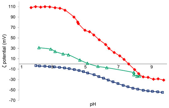 Z-potential vs. pH curves of TAC (red), SiO2 (blue), and TiO2:SiO2 (green) nanosuspension.