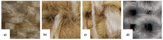 Optical microscopy images of untreated fabrics: (a) SP; (b) SC; (c) SM; (d) C.