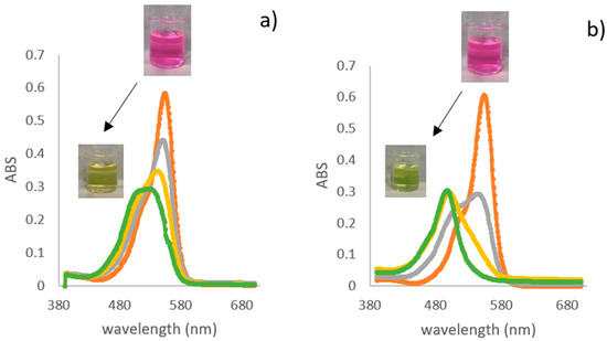 Absorbance of RhB solutions after irradiation under visible light at 0 min (orange), 40 min (gray), 80 min (yellow), and 100 min (green). Time 0: λmax 554 nm; time 100: λmax 527 nm for TACR (a) and 498 nm for TiO2:SiO2 (b).