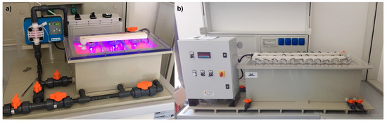 (a) LED-based semi-pilot photocatalytic reactor tested (6 L), used in this study; (b) Up-scaled reactor (100 L) built upon the best design options in the present study.