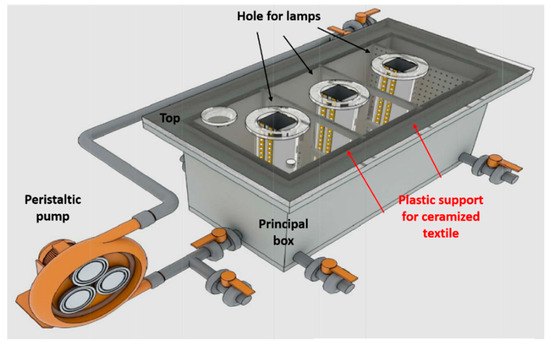 The treated fabrics were integrated and tested in the LED-based semi-pilot photocatalytic reactor of Figure 4a. Figure 4b shows the pilot reactor based upon the best design options identified performing tests with the semi-pilot reactor. The performances obtained with the pilot plant and the evaluation about the scalability of the semi-pilot plant are the objective of a future study.