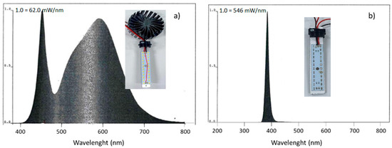 Emission spectrum of (a) visible LED light and (b) UV LED light, including photographs of the corresponding LED strips, mounting an air-cooling fan.